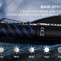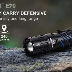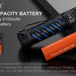 174g, 4,600 Lumens: The AceBeam E70-AL is compact EDC torch with a unique design and a powerful output. It uses one XHP70.2 LED to produce a max output of 4,600 lumens and a 240m beam distance. The E70 has 6 brightness levels and a strobe mode to give you the right amount of light for a variety of situations. The E70-AL runs off a 5100mAh 21700 battery which is directly rechargeable with the USB-C cable (both included).