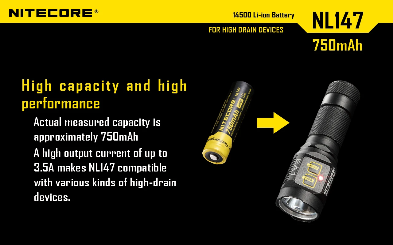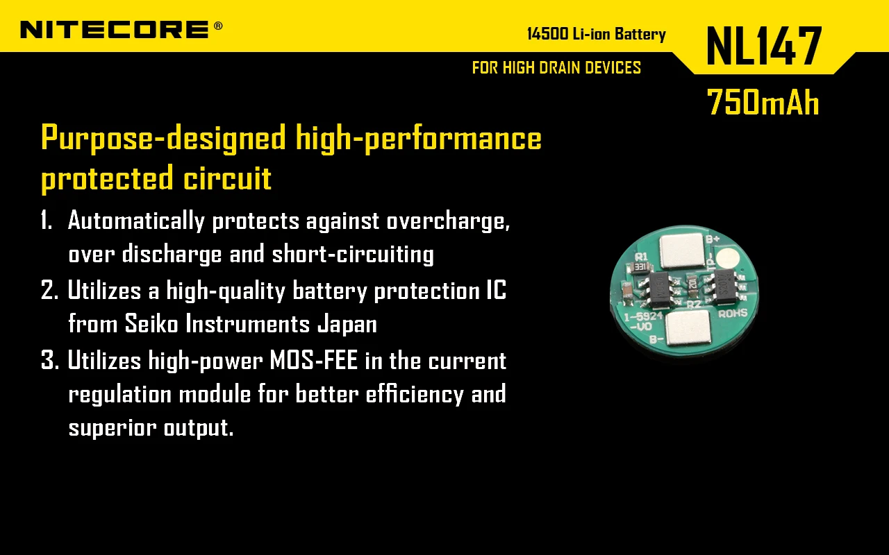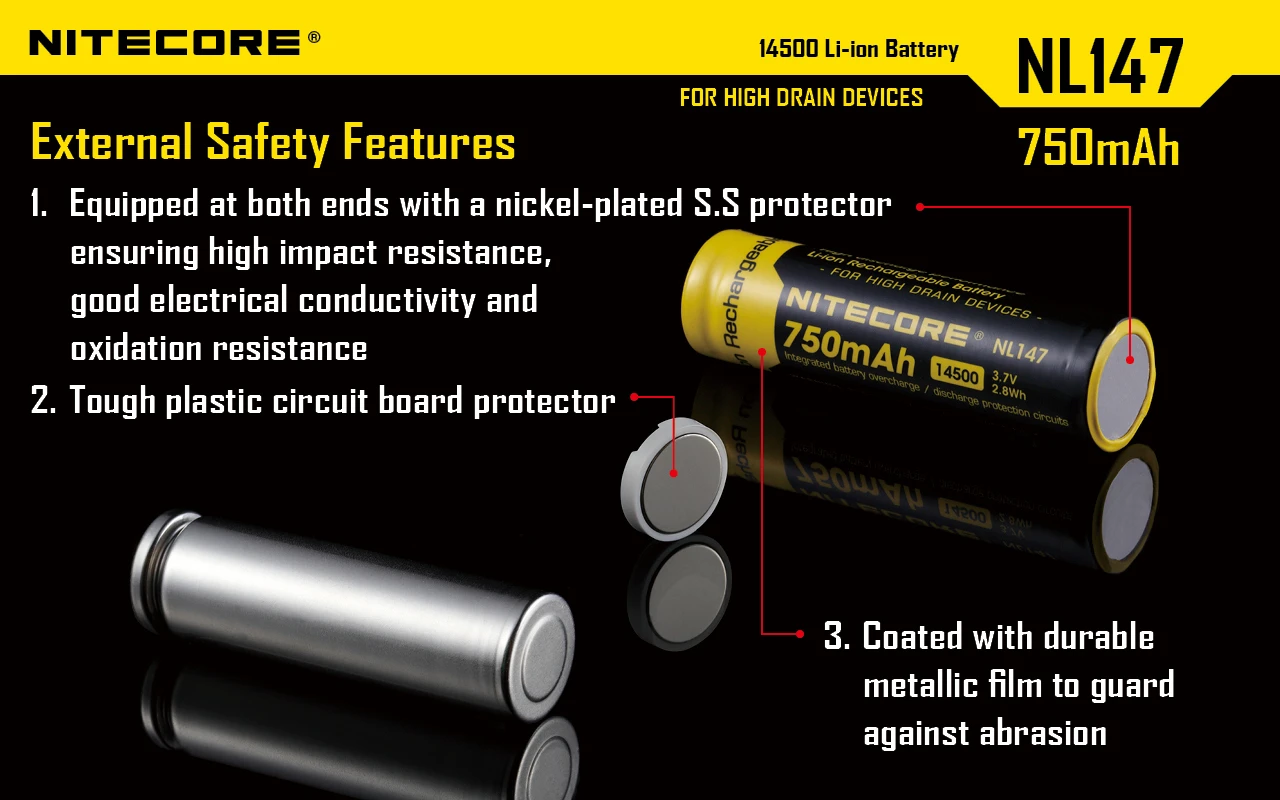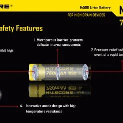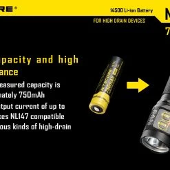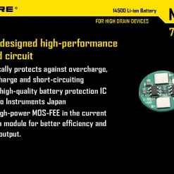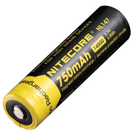 The NiteCore NL147 750mAh 14500 rechargeable li-ion battery has built in IC protection that will protect against damage due to both low and high voltage. These batteries are designed to perform under high discharge applications.