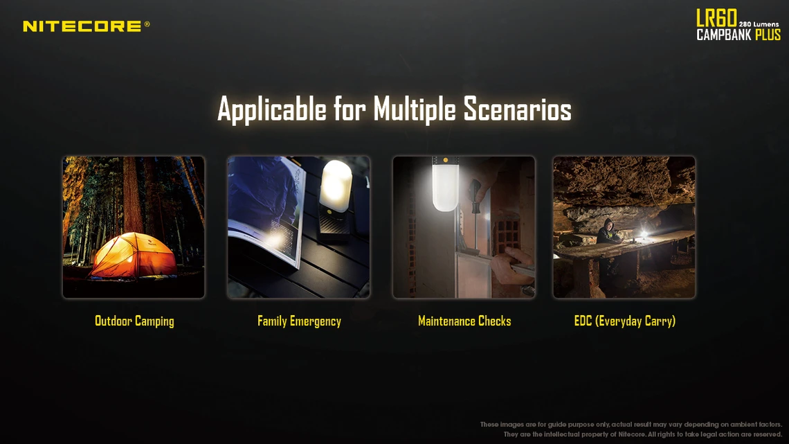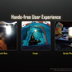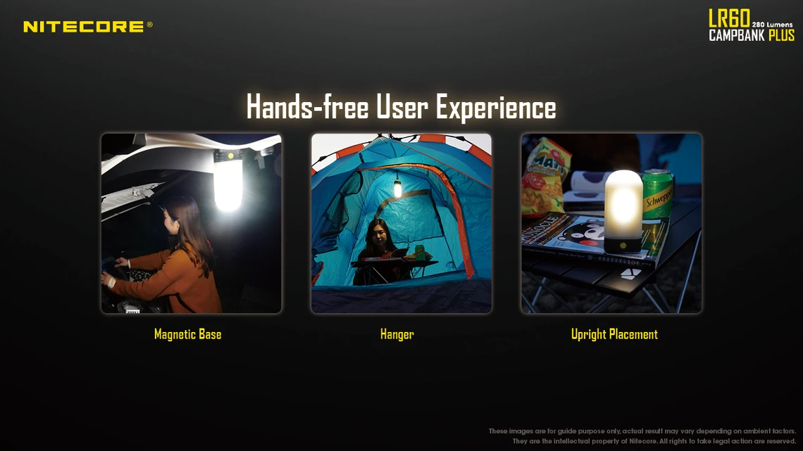 The Nitecore LR60 comes with three different brightness settings which can be adjusted to multiple illumination directions to provide you just the right amount of light in any situation. Stand it on a table and use the forward lighting while reading , or use the hanging loop in your tent for overhead light, or use the magnetic base to mount and direct the LR60 wherever you like!