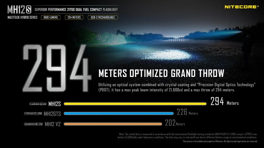 The latest upgrade in the popular MH12 series. Pumps out 1800 lumens in a hand held. Over 290 meters range.