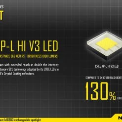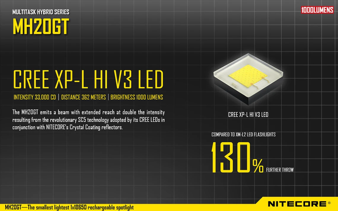 The key factor that distinguishes the Nitecore MH20GT from the MH20, is the new flat LED format. The light is nearly three times more intense than the MH20. This beam is more forward focused giving the impressive top range of 362 meters.