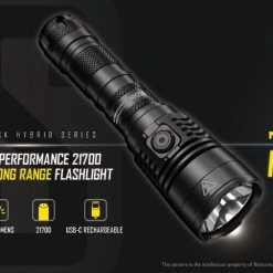 By adding a fat 21700 battery with 5000 mAh capacity, the reflector here is kicking out 1800 lumens over half a kilometer.