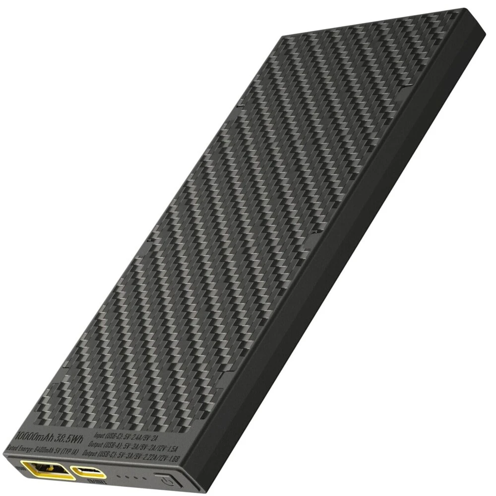 Encased in the carbon fiber case is 10,000 mAh of juice. Its got USB and USBC ports with the full 3 Amps needed for fast charging.