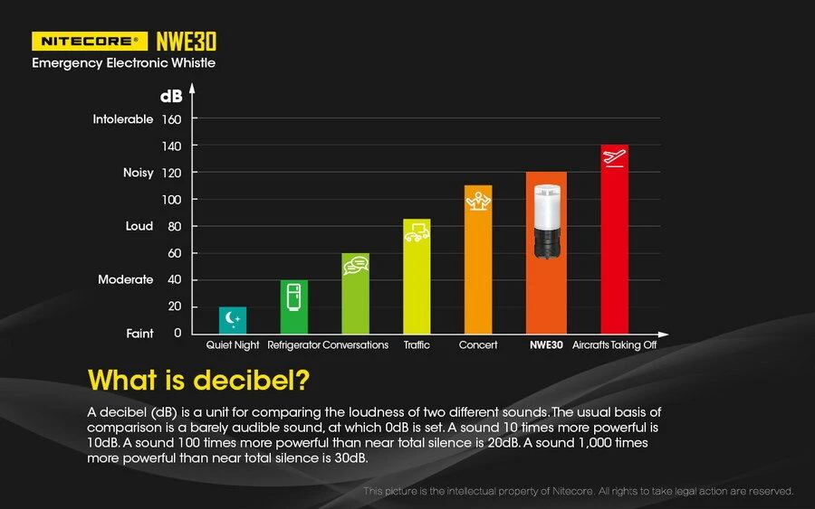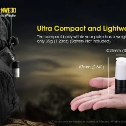 The Nitecore NWE30 is an electronic whistle and beacon designed for outdoor emergency situations. It’s 120dB output is louder than heavy traffic, and can be heard from any angle thanks to its omnidirectional design. At just 2.6 inch long, an inch diameter, and a weight of 1.2oz, NWE30 is ultra compact and lightweight. There’s no reason not to keep it with you hunting, camping, backpacking or on any other outdoor adventure.