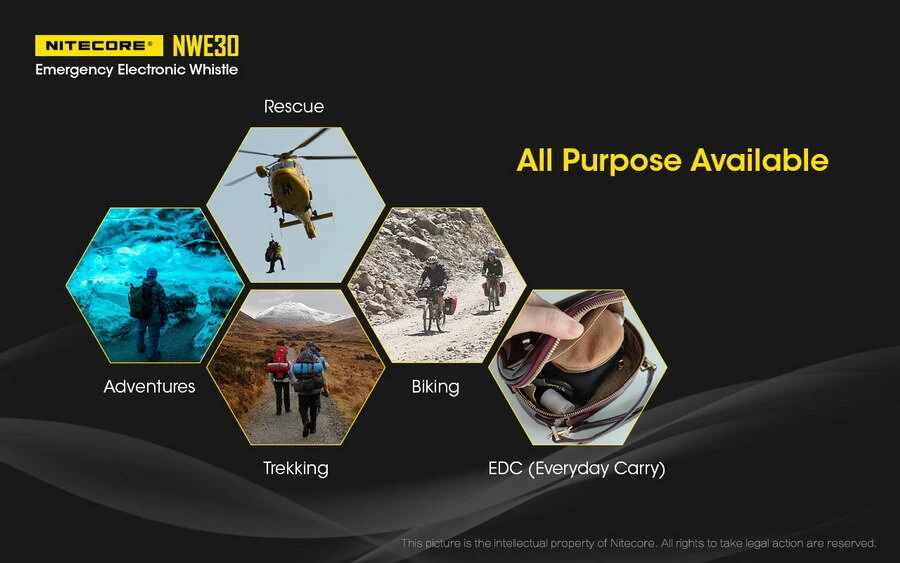 The NITECORE NWE30 is an ultra compact emergency electronic whistle with an easily operable twist-and-buzz interface. Available with a 360-degree buzzing of 120dB, it will also automatically emit an omnidirectional beacon signal flashing of 2,000 lumens at night. With a max runtime of 72 hours, it aims to seize your best opportunity of being rescued.
