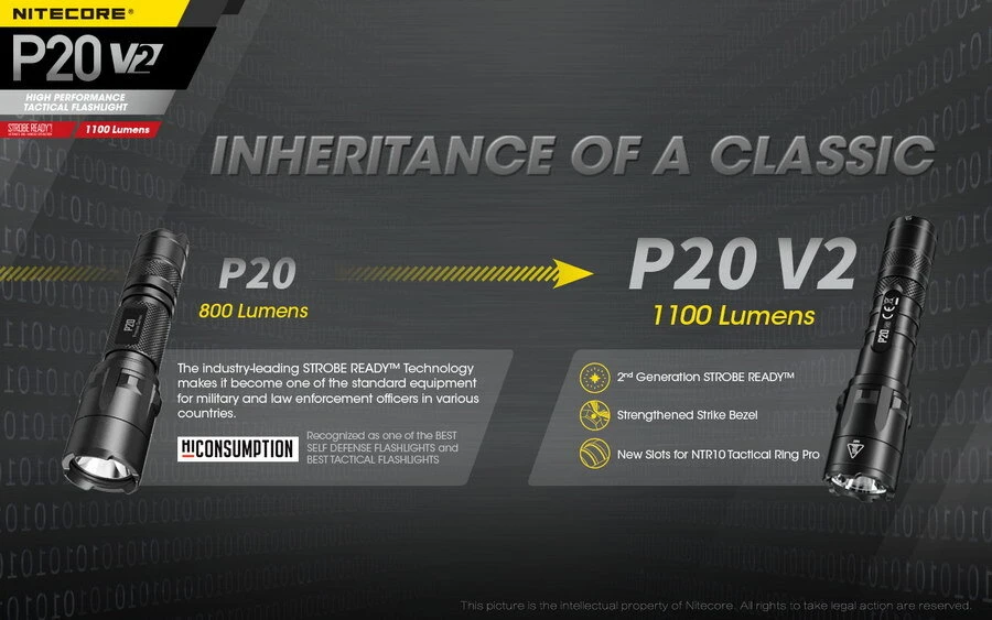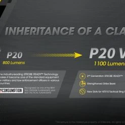 Nitecore raise the bar again for the professional tactical user with the P20 Version 2. This 1100 lumen flashlight reaches up to 220 meters. Constructed using aero-grade aluminum with diamond knurling in key locations for enhanced grip.