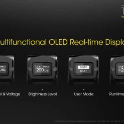 An OLED display shows you real-time information about the chosen setting, the battery level and much more. The light has been enhanced with two switches. With one you can turn the light on and off. With the other you choose the right mode.