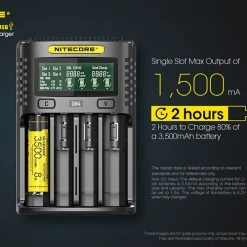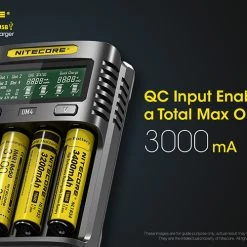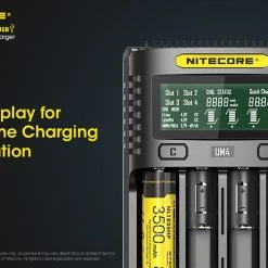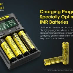 The UM4 automatically identifies and charges Li-ion, Ni-MH and Ni-CD rechargeable batteries using the correct charging mode.
