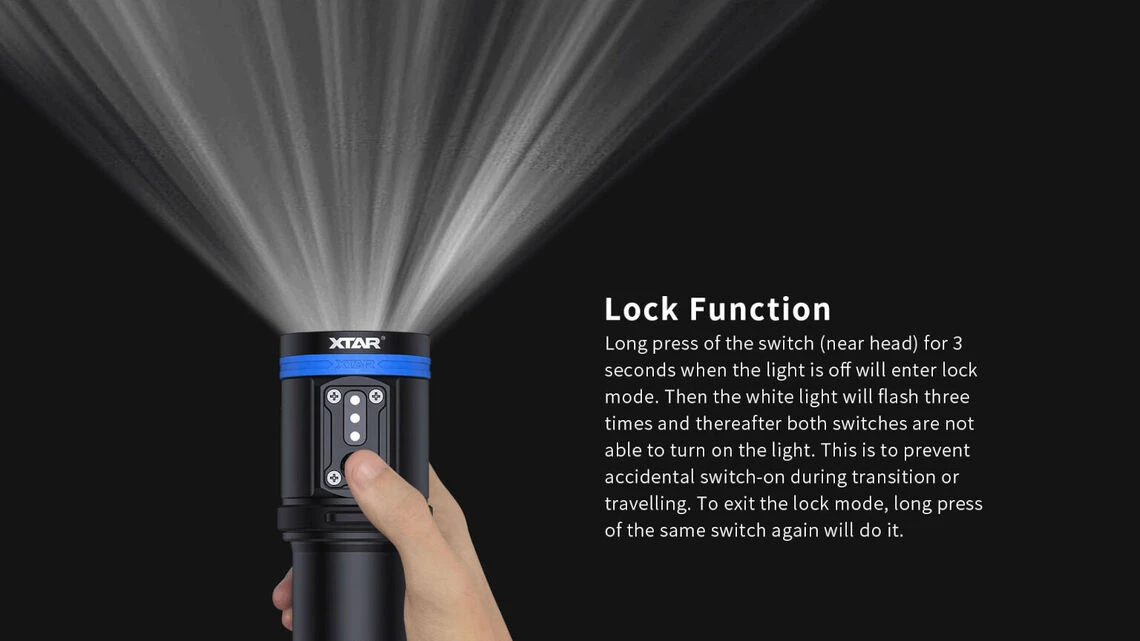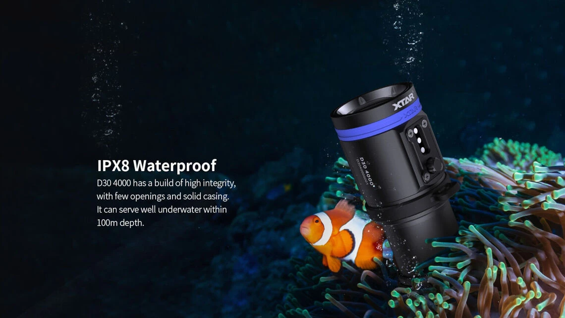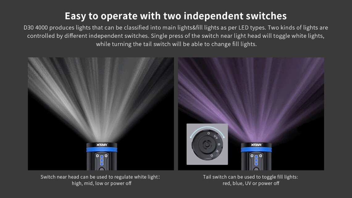 The XTAR D30 4000 is also equipped with fill lights, used for filming and underwater photography. With a CRI of 95+ color rendering index, you can get extraordinary colors in underwater photos and videos. With a choice of several operating modes: High, Medium, Low and Red / Blue / UV. The main switch on the body makes it easy to operate, and the rotating light switch ring with a magnetic adjuster is ideal for controlling the flashlight when taking underwater pictures.