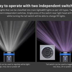 - Press switch for white light, rotary switch for fill lights. Lock function to avoid accidental turn on/off light