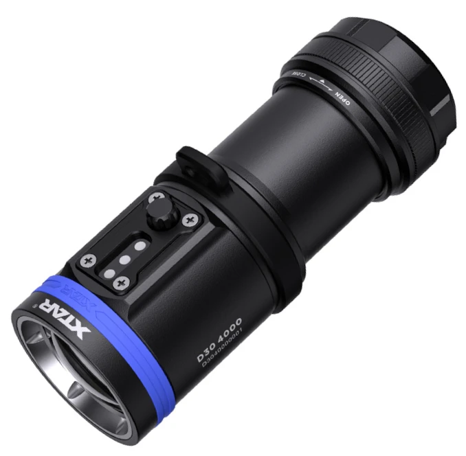 Equipped with 3 LED Power indicator lights, the XTAR D30 4000 will show 3 solid blue lights when the torch has between 66-100% charge, 2 solid blue lights when chage is between 33-66%, 1 solid blue light between 5-33%, and one blinking light when charge is below 5% (bet you wish your scuba tank came with one of these!)